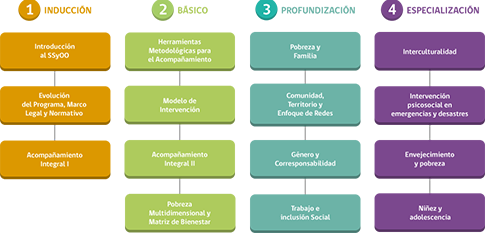 Se organiza en base a una malla curricular, que aborda contenidos relevantes para la ejecución de las tareas y funciones propias del Programa, a través de niveles progresivos de conocimiento: Inducción, Básico, Profundización y Especialización.